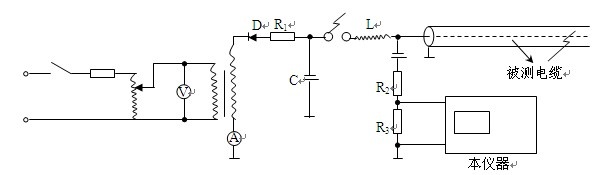 3.按圖所示線路連接設備。地線按要求接好。其中儲能電容C要求大于1μF,耐壓應能滿足試驗要求。其它設備要求與直閃法相同。電感一般取27001中的2或3,也可視被測電纜段的長度或根據反射波形適當增大或減小。